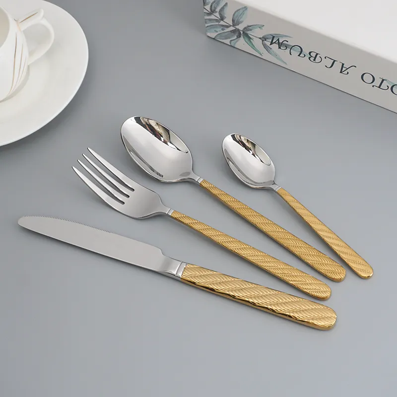 طقم أدوات مائدة ملكي من الفولاذ المقاوم للصدأ لحفلات الزفاف ملمع بالمرآة للبيع الساخن طقم أدوات مائدة حديث فاخر من الفولاذ المقاوم للصدأ الذهبي